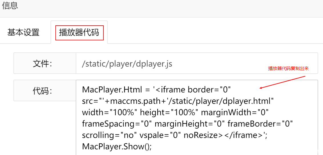 7,最后一步就是把我们刚才复制的DPlayer-H5播放器代码粘贴到这里即可。保存后一个m3u8的播放器就添加成功了。