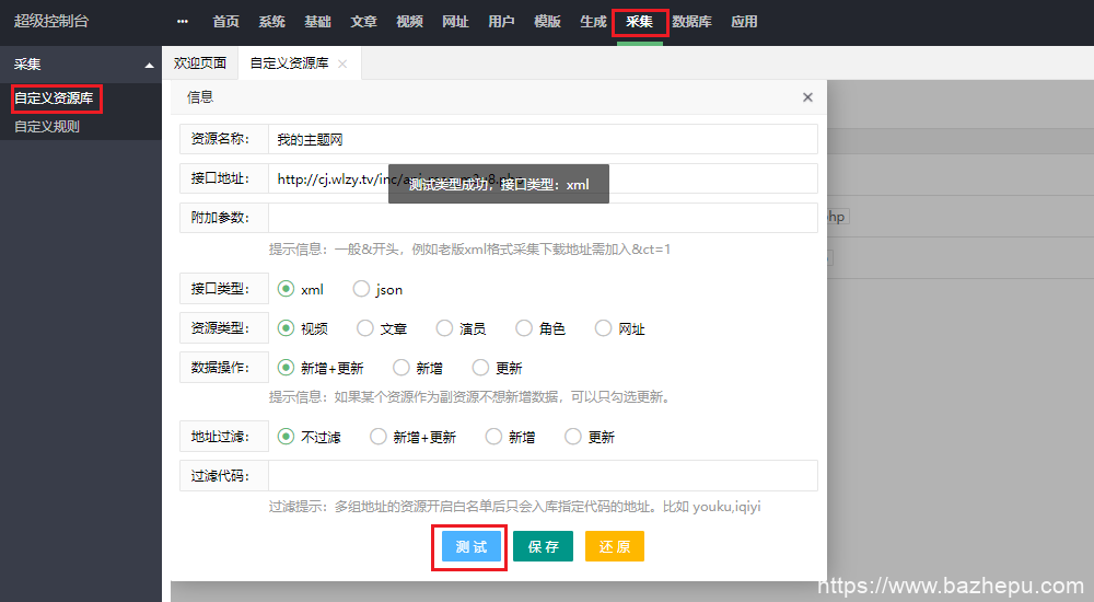 1,今天教大家怎么添加采集苹果cms自定义资源库;进入后台我们随便以某资源站为例,接口可以到你要采集的网站上获取就可以了 一般都在网站的帮助中心:添加方法如下图(添加后进行测试不成功需要填写附加参数 &ct=1)