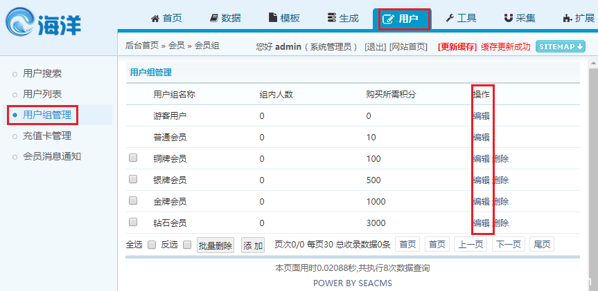 【2】来到海洋cms系统后台,按图中的顺序点击–用户–用户组管理–编辑,我们添加新分类后你可以给予下面六种用户开启权限。假如你想让钻石会员才能观看,那你就只编辑钻石会员即可。如果你想都能查看这个分类,那就需要都编辑下。
